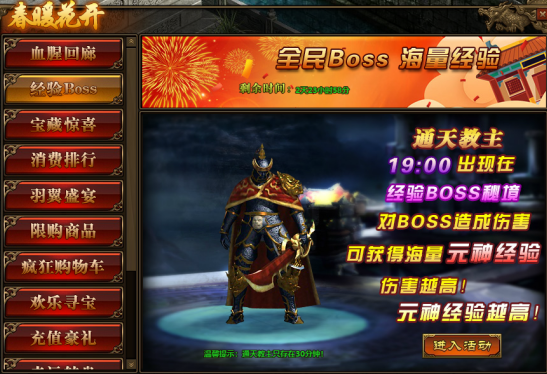 2.活动中,玩家对BOSS造成的伤害,将在活动结束后转换成元神经验并发放;