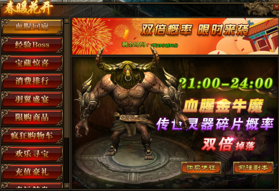 1.活动期间,玩家参与“多人副本-血腥回廊”,获得“传世灵器碎片”的概率翻倍;