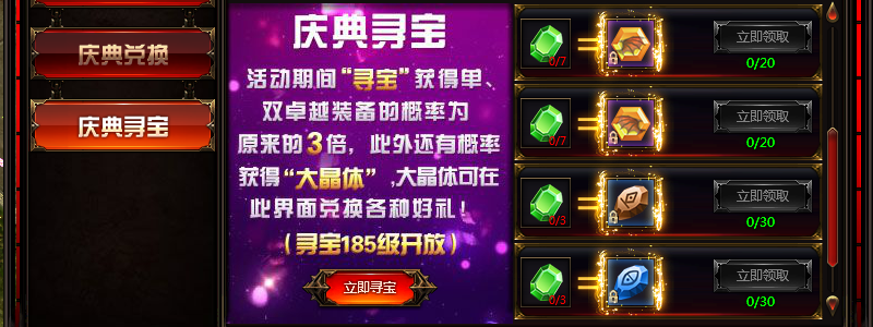 活动内容:玩家在寻宝中有概率可获得大晶体,使用大晶体可兑换游戏中稀有道具,详情请根据游戏中活动兑换页面为准。