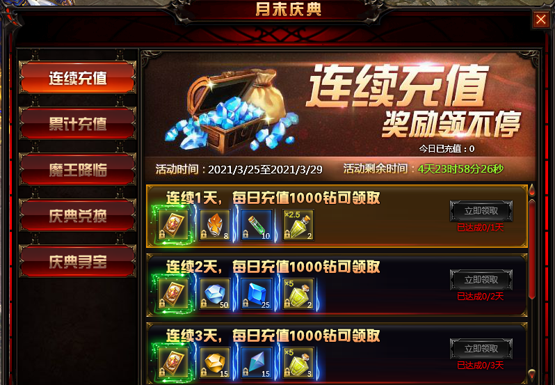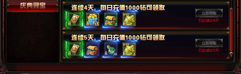 活动内容:活动时间内,玩家每日充值达到1000钻,即可获得丰厚奖励!