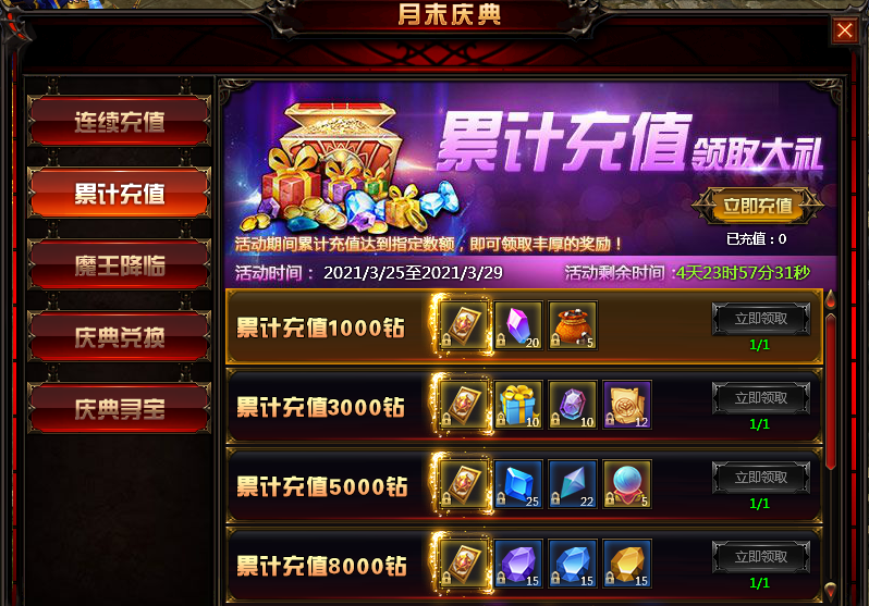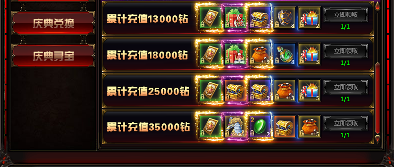 活动内容:玩家在活动时间内,累计充值达到一定钻石即可获得丰厚礼品!