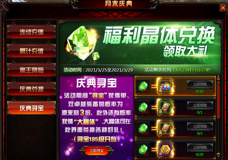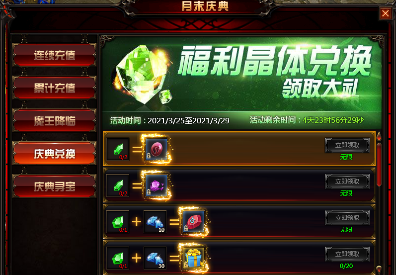 活动内容:玩家在日常挂机击杀小怪可获得小晶体,击杀野外BOSS、黄金BOSS、参与魔王降临活动可获得中晶体,使用不同晶体及钻石比例可兑换游戏中稀有道具,详情请根据游戏中活动兑换页面为准。