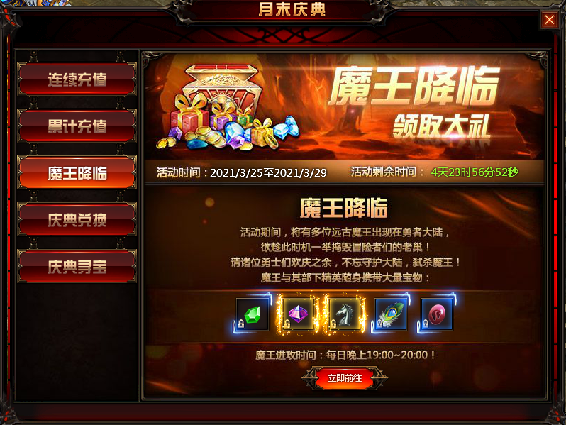 活动内容:活动时间内,每天晚上19:00~20:00勇者大陆会刷新魔王BOSS,击杀BOSS后可获得大量稀有道具奖励。