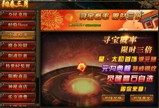 1.活动期间,玩家寻宝概率翻倍,极高几率获得星·太初首饰,传世灵器、传世灵甲,特戒钢纹,混元砂,传世灵器、传世灵甲,不灭意志典籍、元力回响典籍以及觉醒晶石自选宝箱