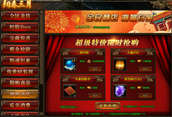 2.神秘商店每2小时自动刷新一次,也可用花费元宝立即刷新;