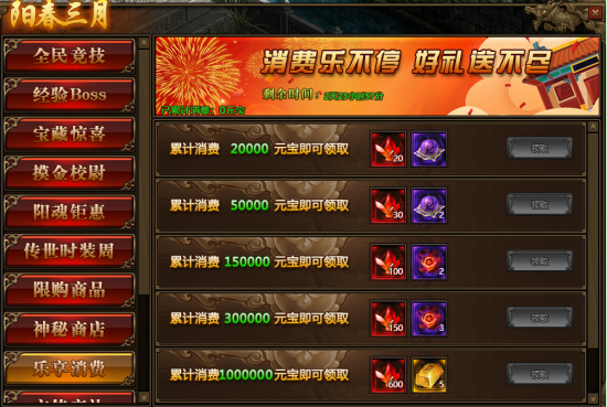 1.活动期间,玩家累计消费满足要求,可以领取境界修为、本职业星石、传世灵戒等相应奖励;