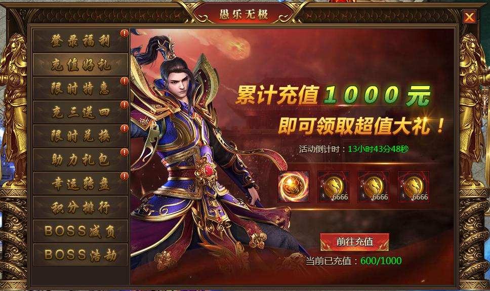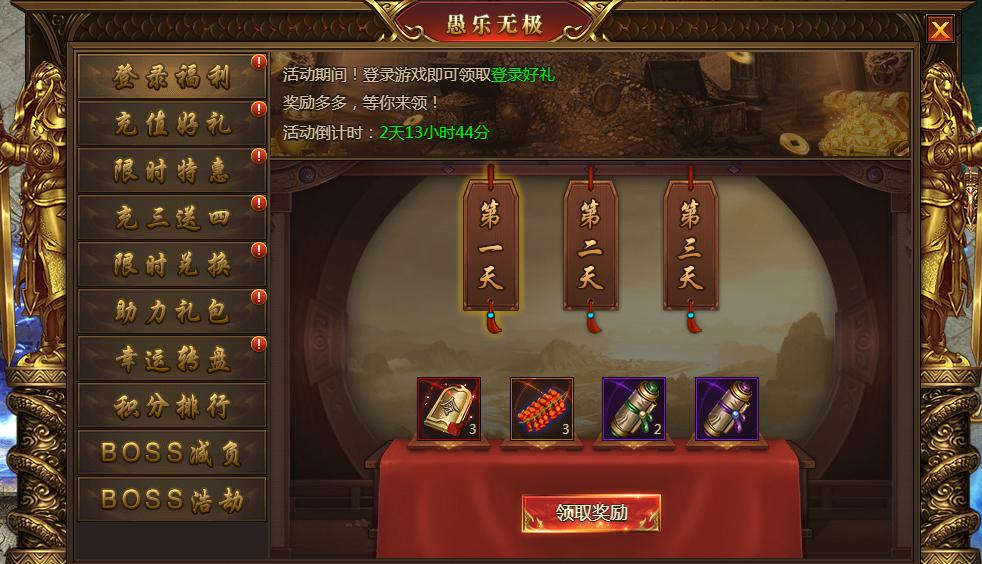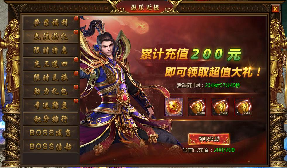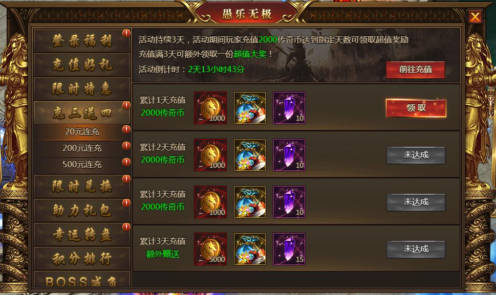 活动内容:充值指定档位可领取超值奖励,累积充值3天可领取额外奖励,共4份