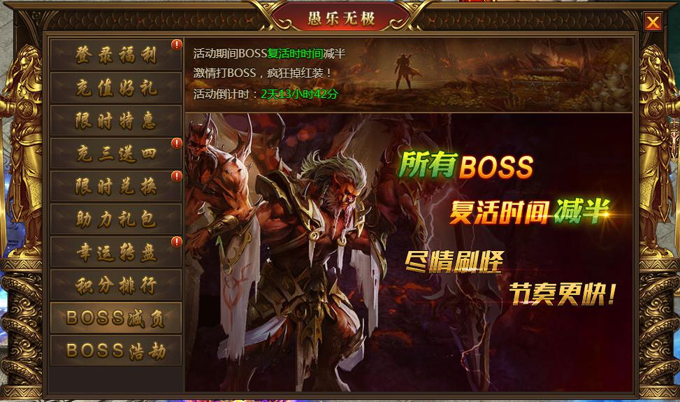 活动内容:活动期间所有boss复活时间减半(跨服boss除外)