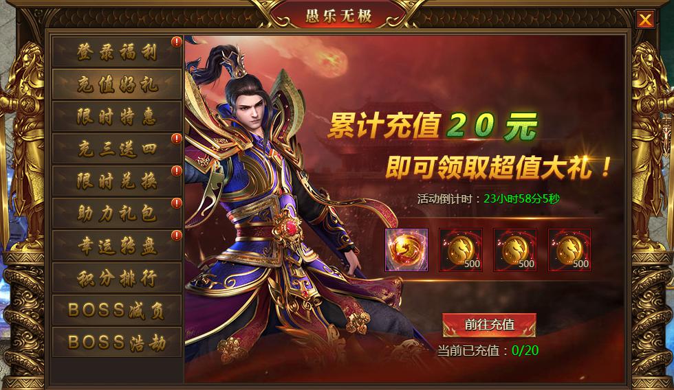 活动内容:活动期间,玩家每日充值20、200、500元、1000元,均可领取超值大礼