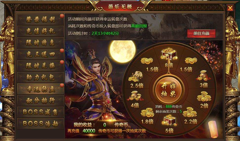 活动内容:活动期间充值可获得转盘次数,消耗次数和传奇币转动转盘,将获得转得的倍数x消耗的等额传奇币奖励