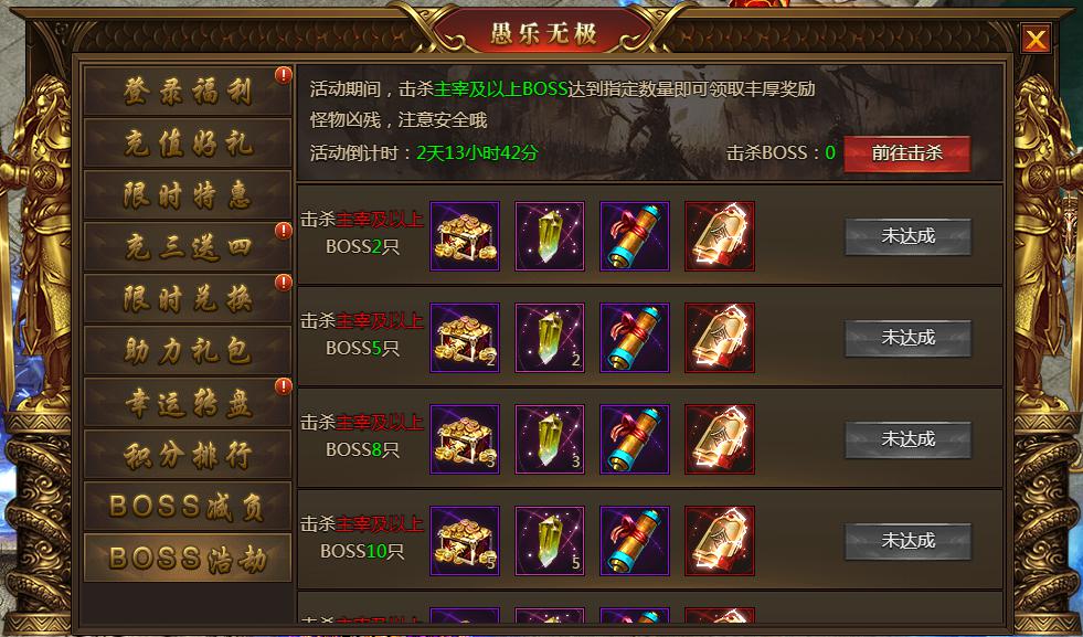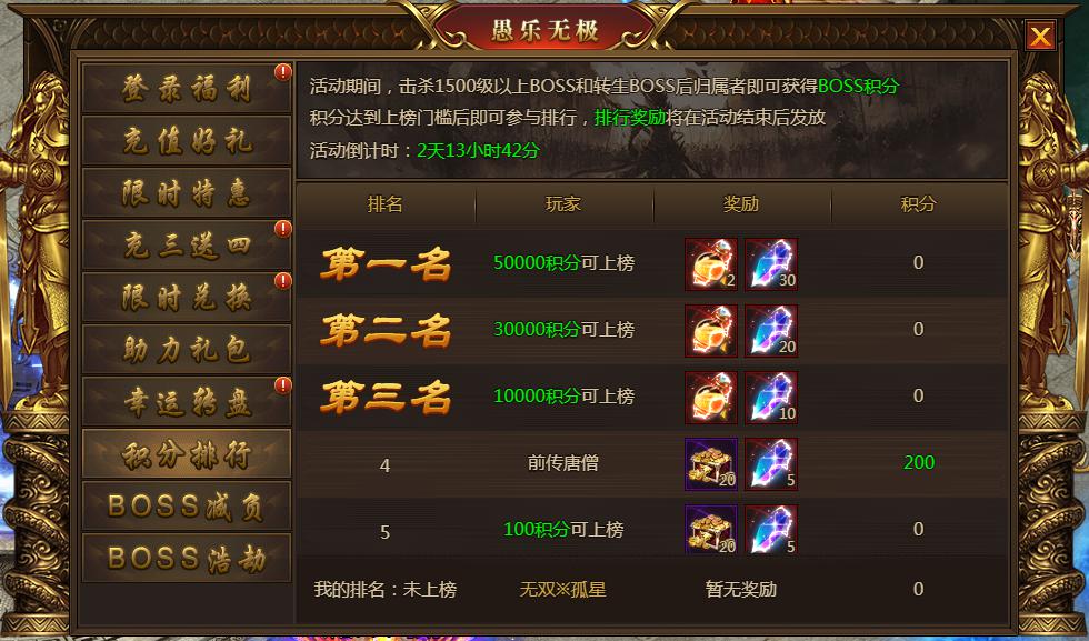 活动内容:活动期间击杀1500级以上的boss和转生boss获得积分,活动结束后更加排行邮件发送奖励