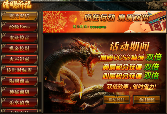 1.活动期间,玩家进入魔魇地图击杀魔魇BOSS可获得双倍掉落,获得魔魇、心魔积分翻倍;