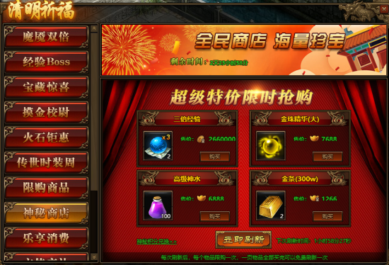 1.活动期间,玩家可在神秘商店中购买商品,商品可用金币,绑元,元宝进行购买;