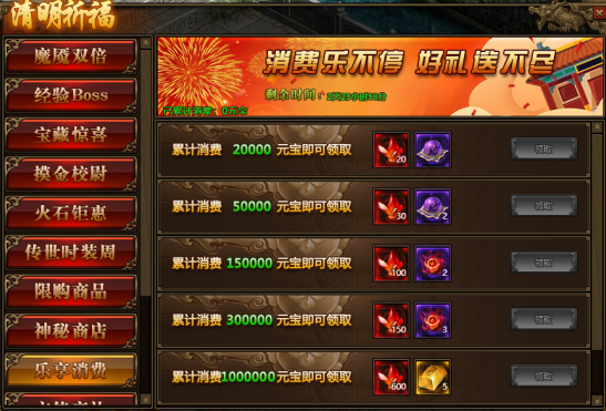 1.活动期间,玩家累计消费满足要求,可以领取境界修为、本职业星石、传世灵戒等相应奖励;