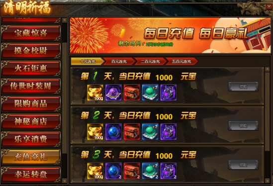 2.连续充值达到3天,奖励翻倍领,更可领取暗影晶石、地狱晶石、随机阵法宝珠宝箱等贵重物品