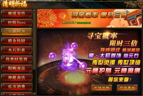 1.活动期间,玩家寻宝概率翻倍,极高几率获得星·太初首饰,特戒钢纹、仙元石、碧落星空,传世灵器、传世灵甲,传世灵器·手镯碎片、传世灵器·项链碎片,元神麻痹特戒以及元神护身特戒