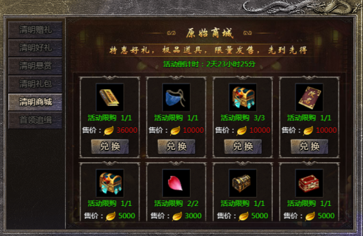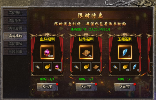 活动内容:活动期间可消耗元宝购买特惠礼包