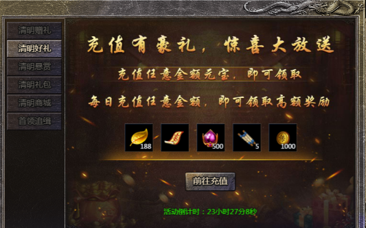 1.活动期间,充值任意金额即可领取超值大礼;