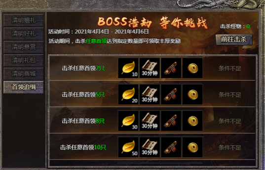 1.活动期间击杀指定数量的怪物即可获得奖励