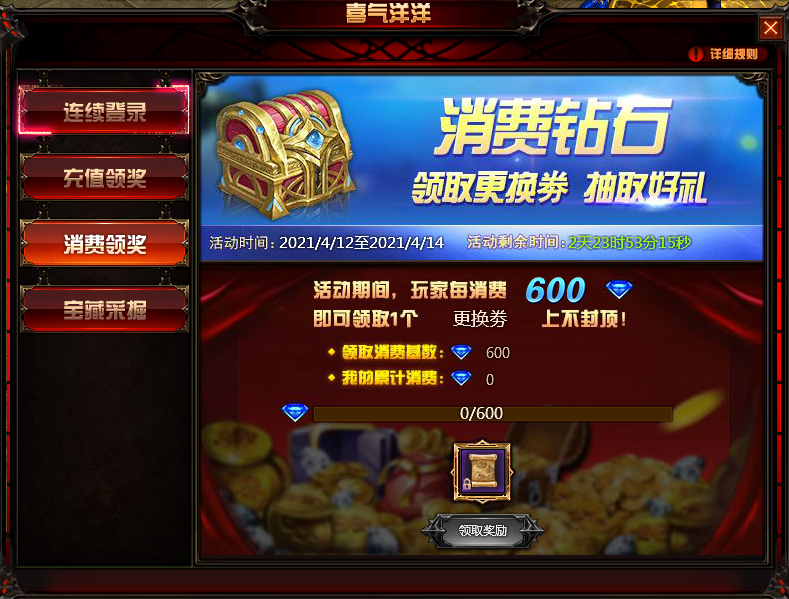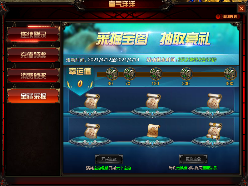每充值300钻石可获得1个“宝藏秘钥”,每消费600钻石可获得1个“更换券”。