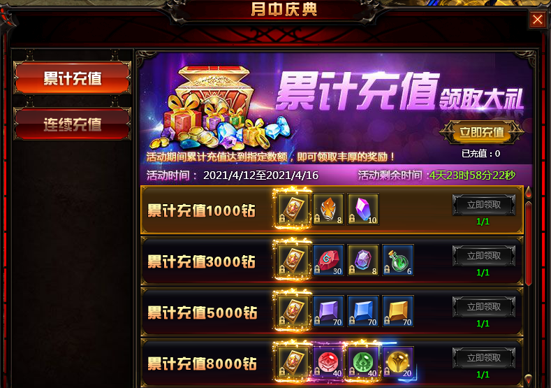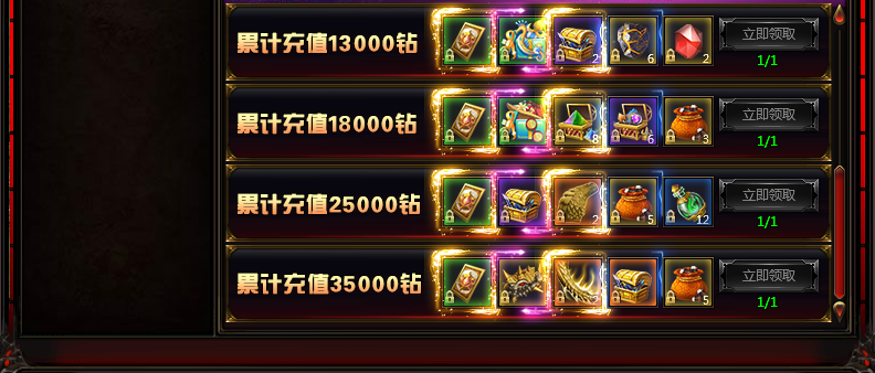 活动内容:玩家在活动时间内,累计充值达到一定钻石即可获得丰厚礼品!