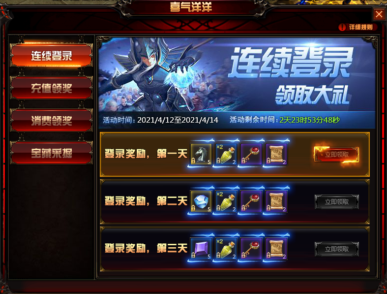 活动内容:玩家在活动时间内,可领取活动期间每日登陆可以获得1个“宝藏秘钥”,2张“更改券”。