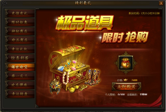 活动期间,每天会随机刷新一批特价道具,花费少量元宝即可购买,每个道具均有每天最大个人购买次数限制,部分道具有购买vip等级限制,买到就是赚到,机会不容错过!
