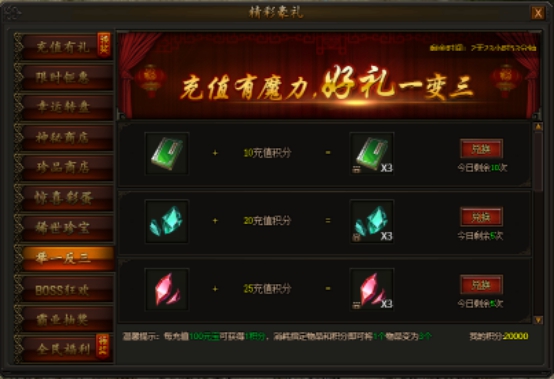 活动说明:活动期间每充值100元宝即可获得1充值积分。使用充值积分可以将一个道具变为3个道具。