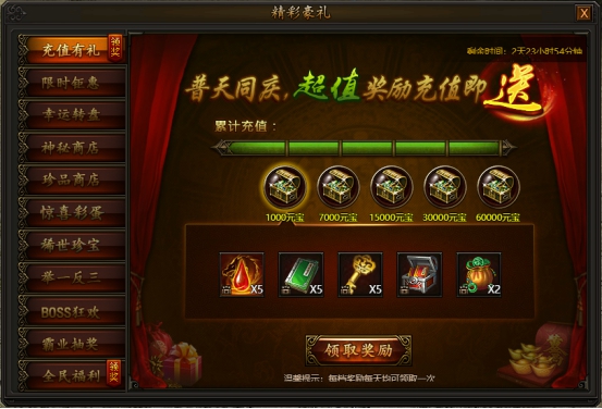 活动期间,充值元宝即可领取五档丰厚奖励,每天均可领取一次,不容错过!