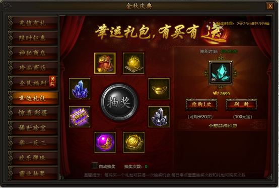 活动期间,每购买一次礼包可获得一次抽奖机会,还可花费元宝进行刷新!抽奖次数和礼包购买次数每日零点清零,请及时抽奖。