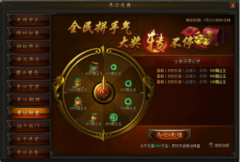 活动期间,充值并消费一定元宝即可使用幸运转盘,获得大量霸业玉道具,使用霸业玉后即可前往霸业商城内购买珍稀道具,精彩不容错过。
