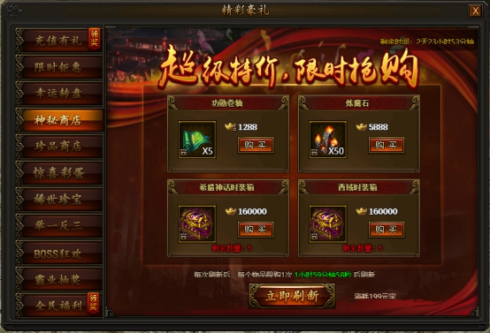 活动期间,每两小时神秘商店会自动刷新一批道具,也可花费元宝立即刷新,大量道具限时等你抢购。