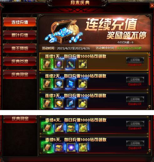 活动内容:活动时间内,玩家每日充值达到1000钻,即可获得丰厚奖励!
