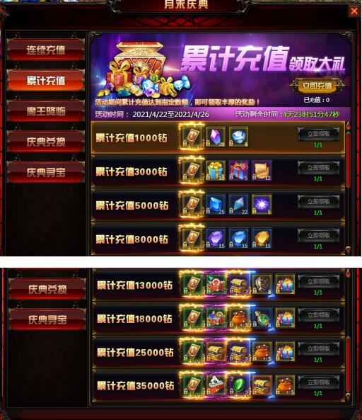 活动内容:玩家在活动时间内,累计充值达到一定钻石即可获得丰厚礼品!