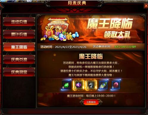 活动内容:活动时间内,每天晚上19:00~20:00勇者大陆会刷新魔王BOSS,击杀BOSS后可获得大量稀有道具奖励。