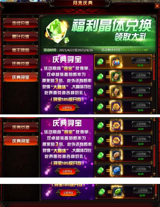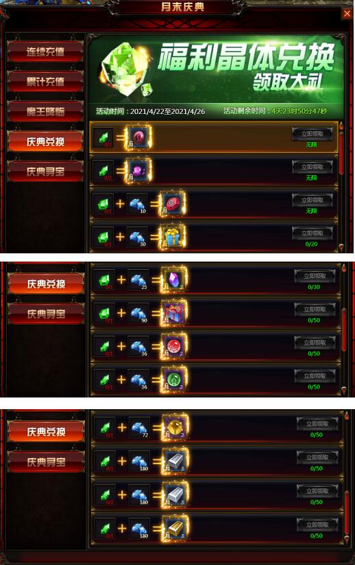 活动内容:玩家在日常挂机击杀小怪可获得小晶体,击杀野外BOSS、黄金BOSS、参与魔王降临活动可获得中晶体,使用不同晶体及钻石比例可兑换游戏中稀有道具,详情请根据游戏中活动兑换页面为准。
