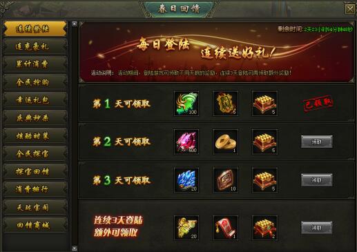 活动说明:活动期间,登陆游戏可领取不同天数的奖励,连续3天登陆可再领取额外奖励