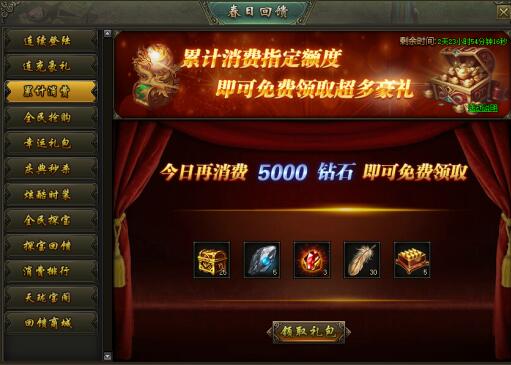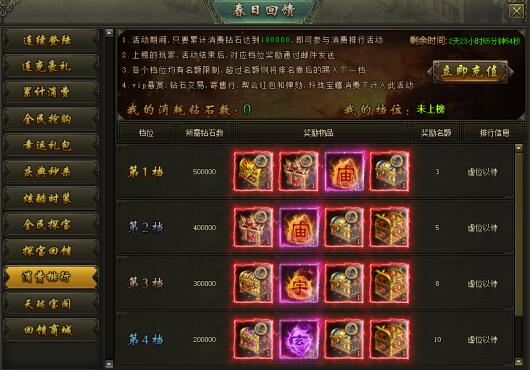 活动说明:活动期间,累计消费达到100000钻石的玩家参与排行,达到对应档位的玩家奖励在活动结束后以邮件的方式进行发放