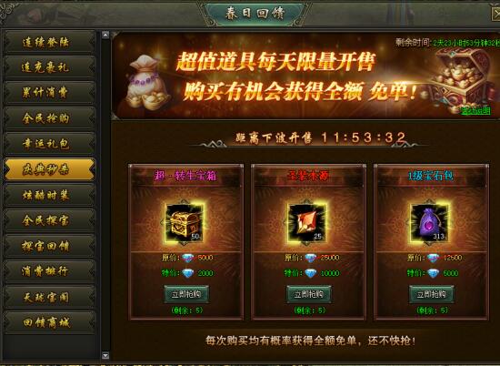 活动说明:活动期间,超值道具每天限量开售,购买就有机会获得全额免单!