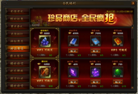 活动期间,每天会随机刷新一批特价道具,花费少量元宝即可购买,每个道具均有每天最大个人购买次数限制,部分道具有购买vip等级限制,买到就是赚到,机会不容错过!
