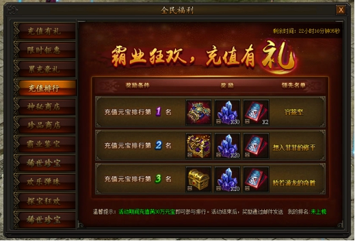 活动期间,累计充值元宝数满30w可参与排行,排行前三即可获得对应霸业装备和极品首饰奖励。