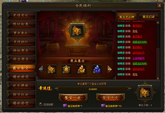 活动期间,花费一定数量鉴宝券即可进行霸业鉴宝,每次鉴宝均可获得祝福值,祝福值满后下一次鉴宝必出极品大奖,数量有限,不容错过。