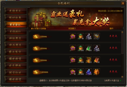 活动期间,累计充值一定数量元宝,即可领取对应档奖励,每个角色只能领取一次。