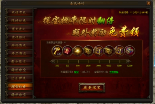 活动期间,探宝超值回馈限时开启!活动期间探宝可获得祝福值,祝福值达到一定数值即可领取霸业装备奖励!