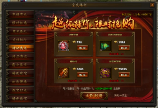 活动期间,每两小时神秘商店会自动刷新一批道具,也可花费元宝立即刷新,大量道具限时等你抢购,数量有限,先买先得。