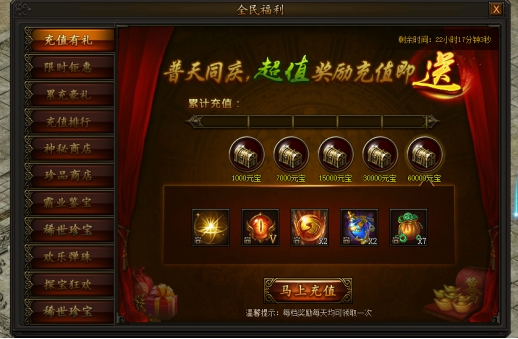 活动期间,充值元宝即可领取多档丰厚奖励,每天均可领取一次,不容错过!