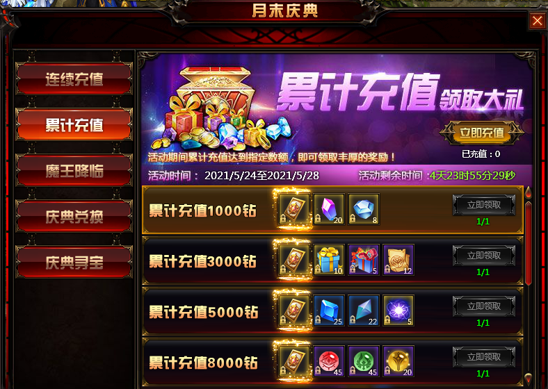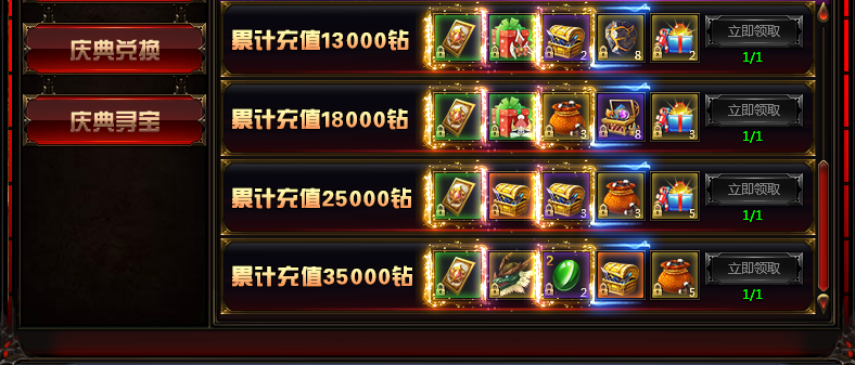 活动内容:玩家在活动时间内,累计充值达到一定钻石即可获得丰厚礼品!
