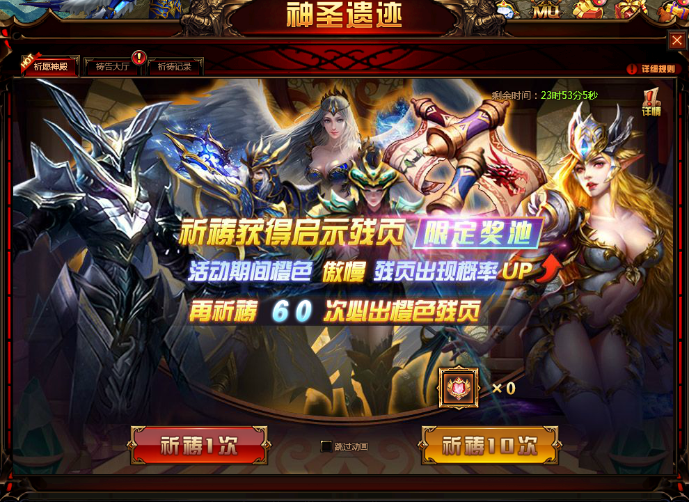 1. 祈愿神殿是神圣遗迹限时开启的一种特殊奖池,祈愿神殿中限定的橙色残页获得的概率会极大的提升