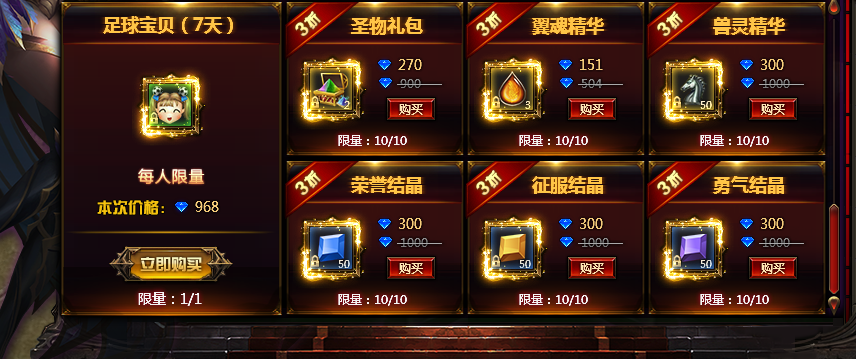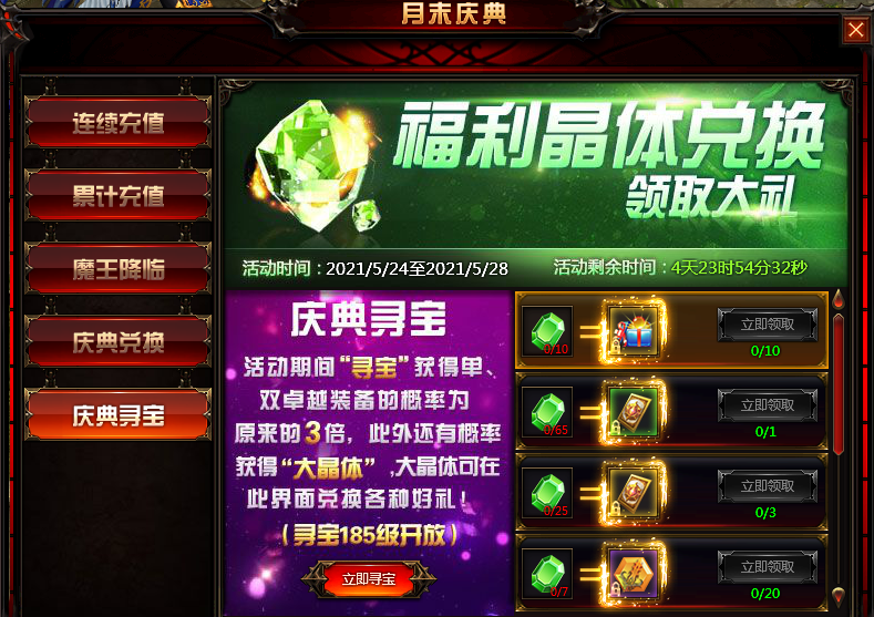 活动内容:玩家在日常挂机击杀小怪可获得小晶体,击杀野外BOSS、黄金BOSS、参与魔王降临活动可获得中晶体,使用不同晶体及钻石比例可兑换游戏中稀有道具,详情请根据游戏中活动兑换页面为准。