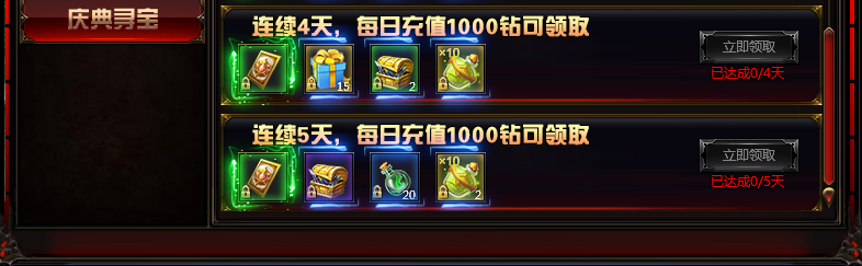 活动内容:活动时间内,玩家每日充值达到1000钻,即可获得丰厚奖励!